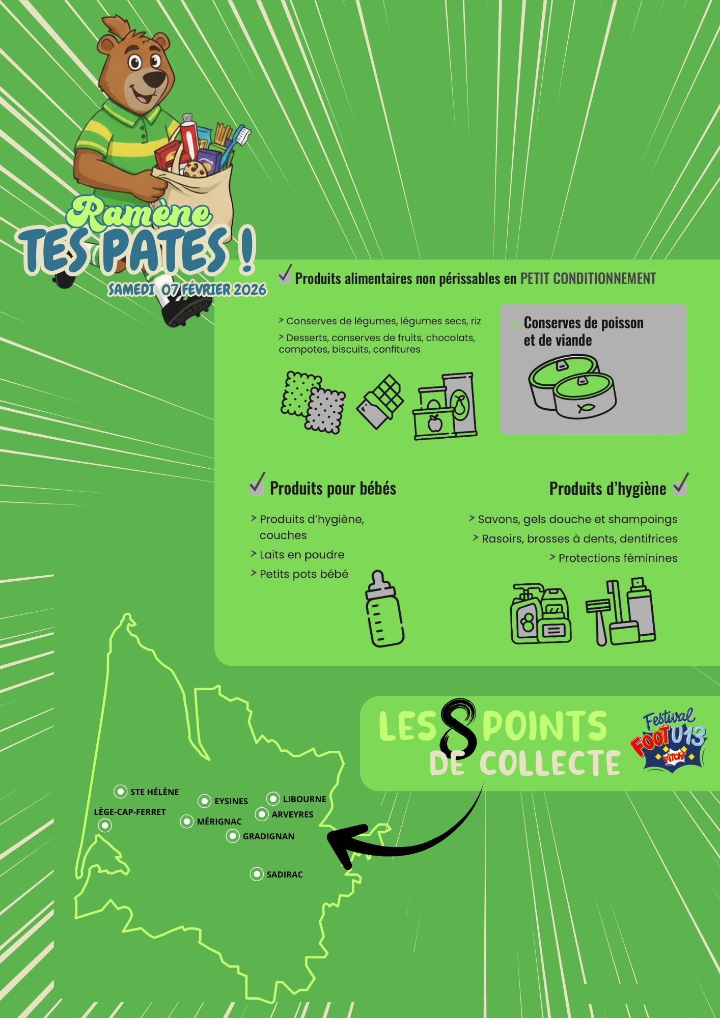 Cette année, lors du second tour du Festival Foot U13 Pitch, le samedi 07 février 2026, nous lançons une grande campagne de collecte de produits alimentaires et d’hygiène avec les Restos du Cœur de Gironde. Notre objectif est simple : mobiliser chaque jeune participant pour qu’il apporte sa contribution à cette belle cause, en offrant des produits alimentaires et/ou d’hygiène, afin de soutenir les actions de cette association d’aide locale.