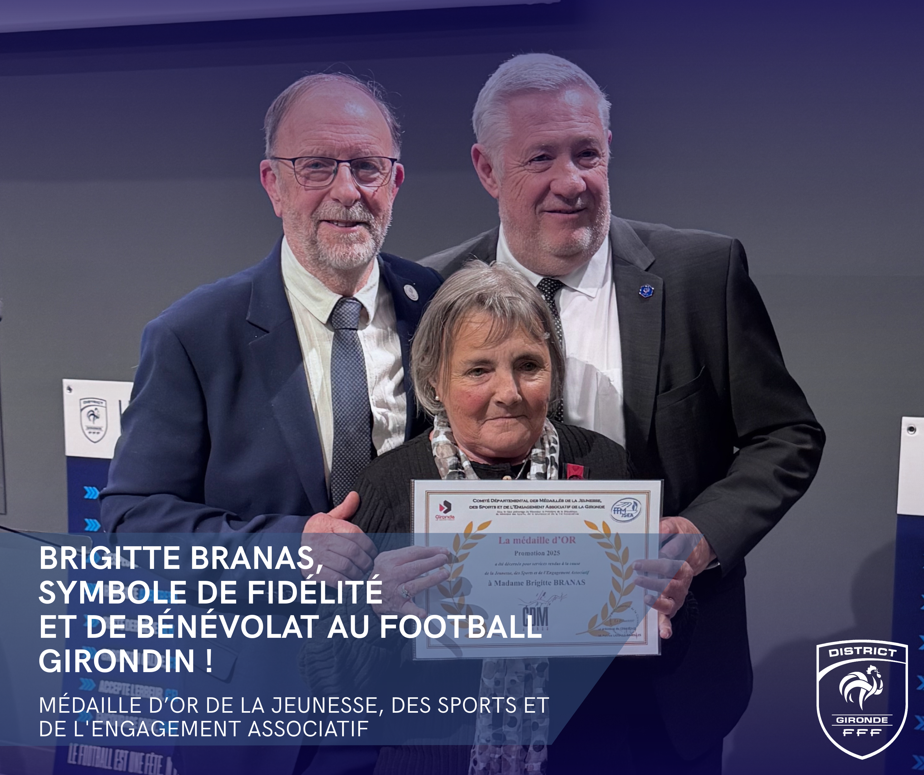 Aujourd’hui, Madame Brigitte Branas reçoit la Médaille Départementale de la Jeunesse et des Sports – Échelon Or, en hommage à son engagement durable, son exemplarité et son impact sur le club et le football girondin.