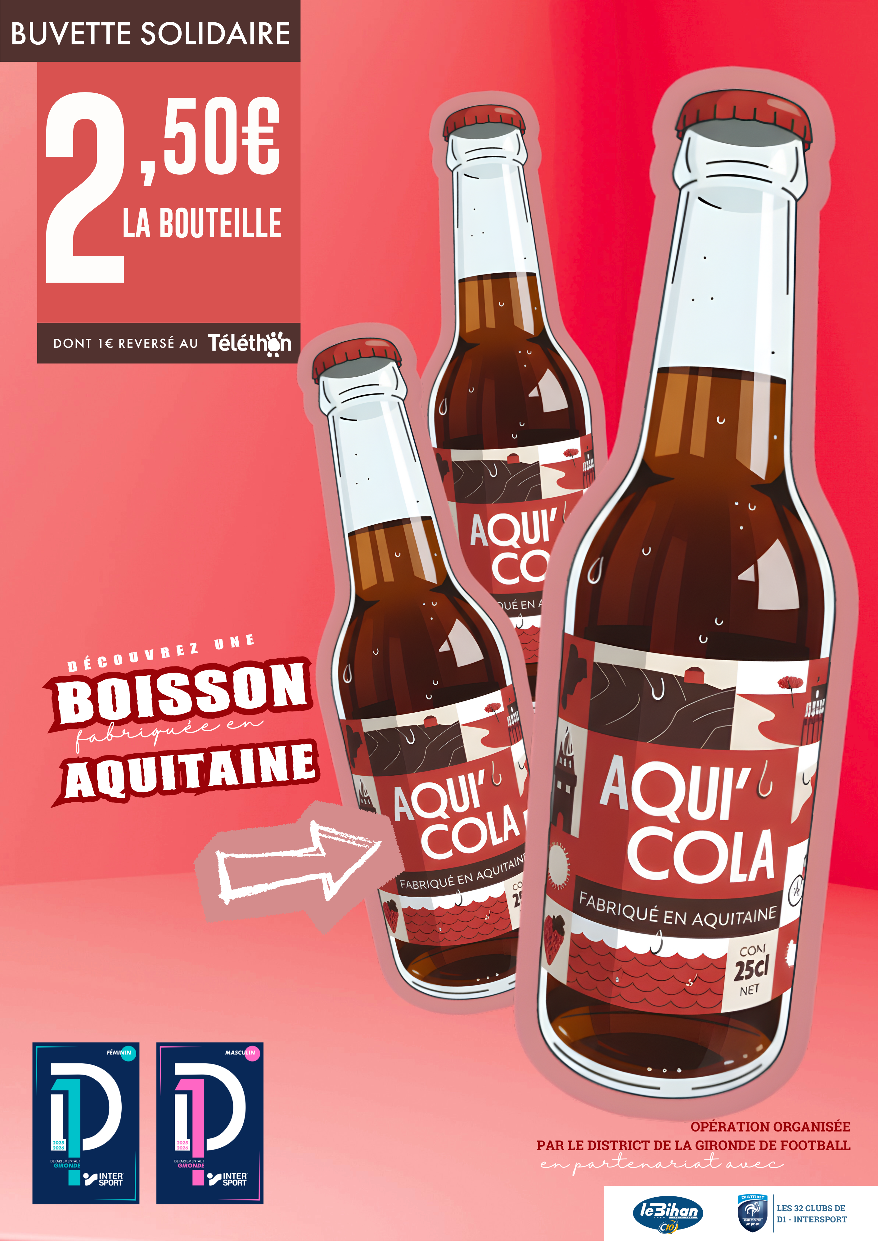 Grâce au partenariat avec Le Bihan TMEG, chaque club participant recevra un lot de bouteilles Aqui’Cola, dont une partie des ventes effectuées dans les buvettes sera reversée directement au Téléthon. Cette initiative permet de collecter des fonds tout en impliquant licencié(e)s, supporters et publics présents dans un geste concret de solidarité.