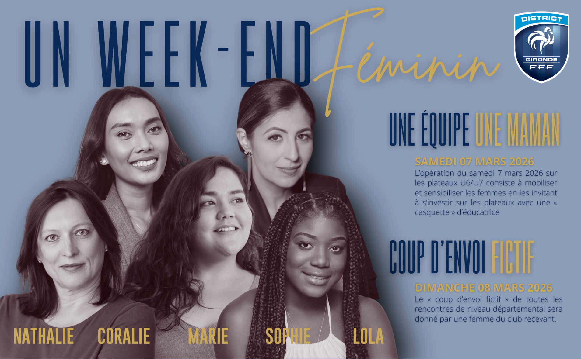 Dimanche 8 mars 2026, le « coup d’envoi fictif » de toutes les rencontres de niveau départemental sera donné par une femme dirigeante du club recevant. Cette opération vise à mettre en avant les femmes dirigeantes et joueuses de l’ensemble des clubs girondins.